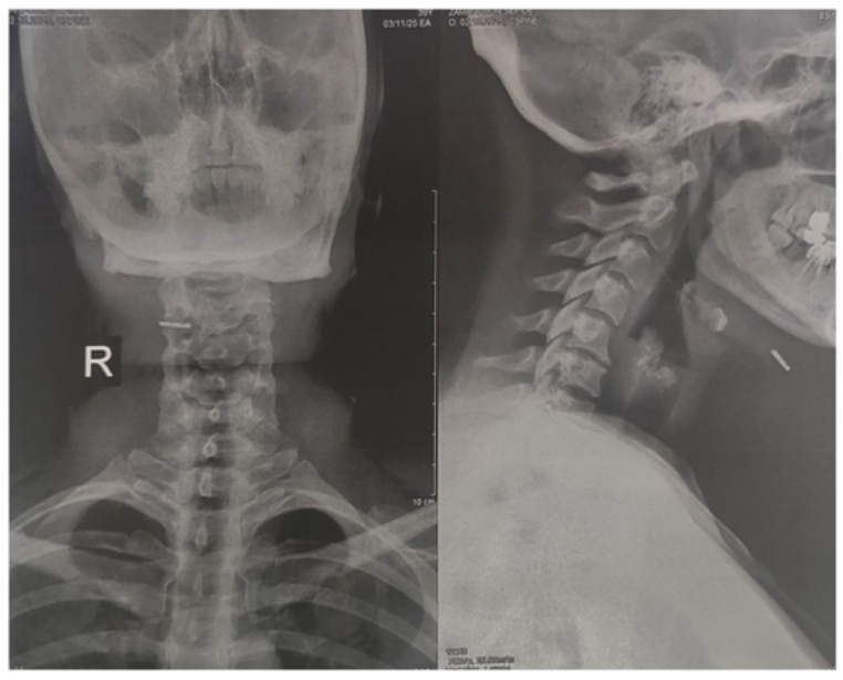 Based on the clinical presentation and procedural history, the differential diagnosis included postoperative fibrosis, fat necrosis, calcified hematoma, granuloma, and retained foreign body related to the prior liposuction procedure. Neck radiography demonstrated an opaque, linear structure located anterior to the hyoid bone on both anteroposterior and lateral views.