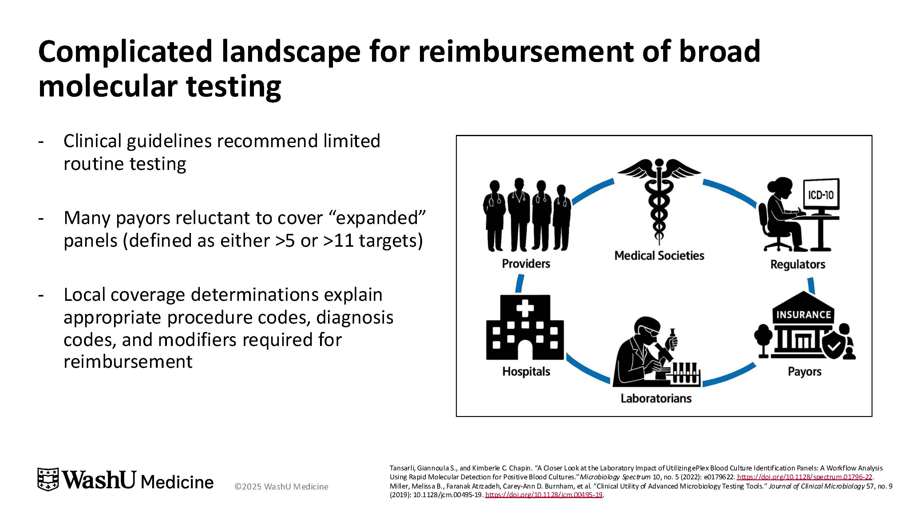 Reimbursement challenges are a significant factor, said Dr. Dumm (Figure 2). Clinical guidelines generally recommend limited testing for acute GI illness, which leads insurers to view “expanded” panels (with more than 5 or more than 11 targets) as unnecessary. As a result, reimbursement often requires strict criteria—such as ordering by an infectious disease or GI specialist for immunocompetent patients, or by oncology or critical care clinicians for immunosuppressed patients. “The reimbursement landscape for these broad panels is extremely complicated,” Dr. Dumm said. “Institutions face higher overall costs when tests exceed guideline-supported use.” She noted that the uncertain clinical impact of some rare targets further complicates justification for routine use, reinforcing the need for diagnostic stewardship.