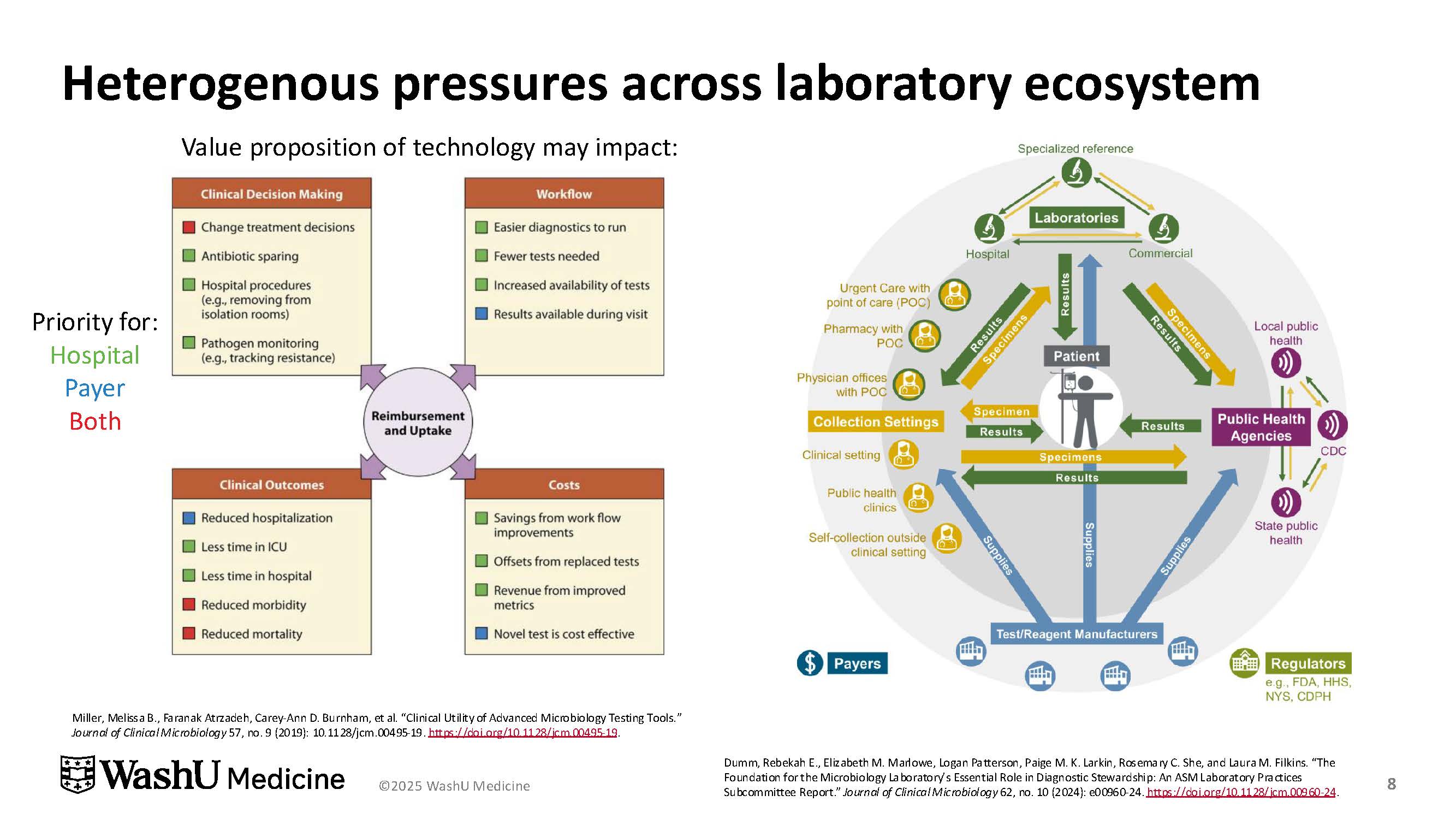 Dr. Dumm stressed that diagnostic stewardship requires collaboration across the laboratory ecosystem, involving infectious disease specialists, clinicians, nurses, information technology teams, and hospital leadership. Interdisciplinary efforts help laboratories align clinical priorities with cost considerations and institutional metrics, while also addressing the pressures of reimbursement and evolving testing technologies (Figure 3).