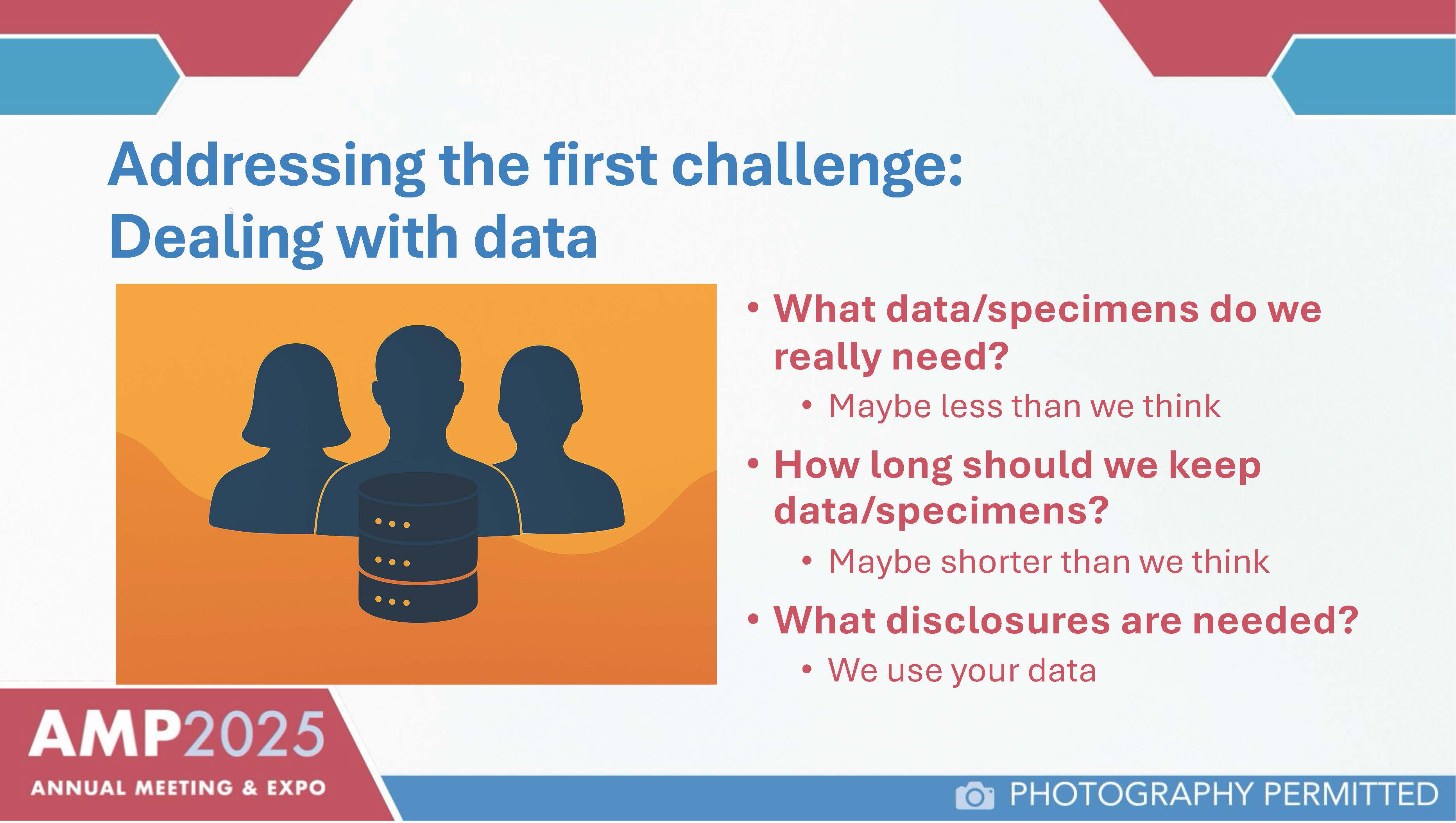 Managing health care data responsibly is a central challenge. Dr. Matose noted that “data are only useful in aggregate” and must be treated as "social facts"—collected by humans, shaped by society, and meaningful only within social systems. They are not objective, unbiased truths. Genetic or clinical information about one person can reveal insights about families, communities, or populations, making privacy and security critical concerns. He highlighted the need for updated regulatory and conceptual frameworks that match today’s technological landscape, suggesting that institutions reconsider long-held assumptions about data collection, retention, and disclosure (Figure 5).