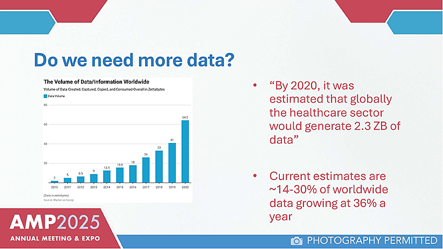 Dr. Matose challenged the widespread assumption that adding more genomic, imaging, and clinical data automatically produces better AI models. He shared estimates showing that health care now generates between 14% and 30% of all global data (Figure 2)—yet only a small fraction is analyzed or used meaningfully.