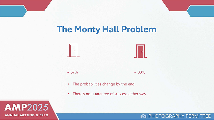 He proposed that AI should be understood as a tool for performing complex conditional-probability calculations—calculations that shift with each new input, pipeline choice, annotation step, or contextual variable. To illustrate this, he walked the audience through the classic Monty Hall probability puzzle (Figure 3), noting that AI systems can remove options known to be wrong—“take away bad options”—but cannot guarantee a correct answer. “There’s no guarantee of success either way,” he said. “You could still get the prize if you stick with your original choice. Alternately, if you switch, there’s no guarantee of getting the prize.”