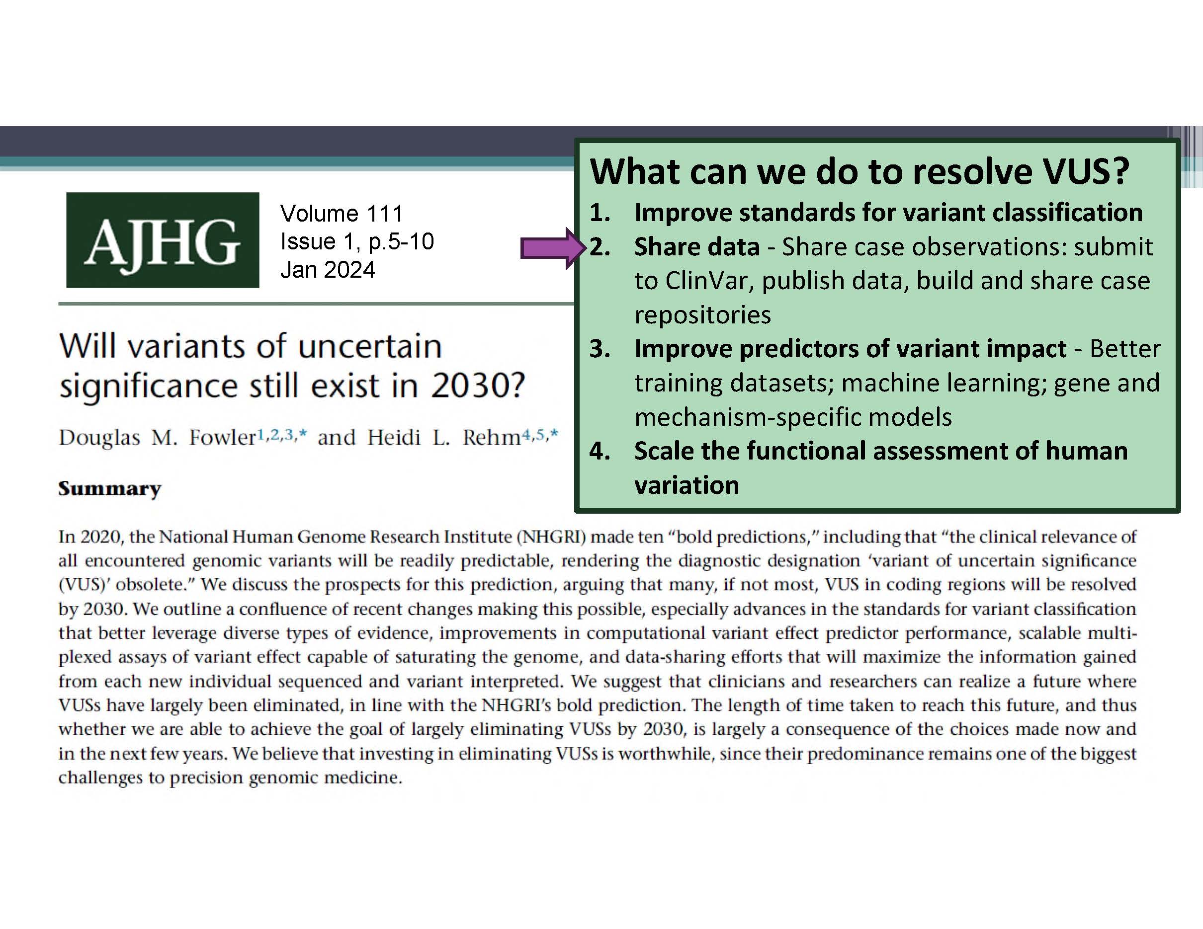 To improve understanding and resolution of VUS, improving standards for variant classification is a core focus. The draft Standards for Sequence Variant Classification v4.0 (SVCv4) represent a joint effort of the American College of Medical Genetics and Genomics (ACMG), Association for Molecular Pathology (AMP), College of American Pathologists (CAP), and Clinical Genome Resource (ClinGen). As an update to the 2015 ACMG-AMP standards, SVCv4 retains the major 5-tier scale from benign to pathogenic but adjusts the criteria for classification. “Among many adjustments to evidence scoring, it will become easier for variants to get to ‘likely benign,’ so the new standards will inherently reduce the VUS rate. This change is based on data on the direction of most VUS reclassification toward benign,” she explained.