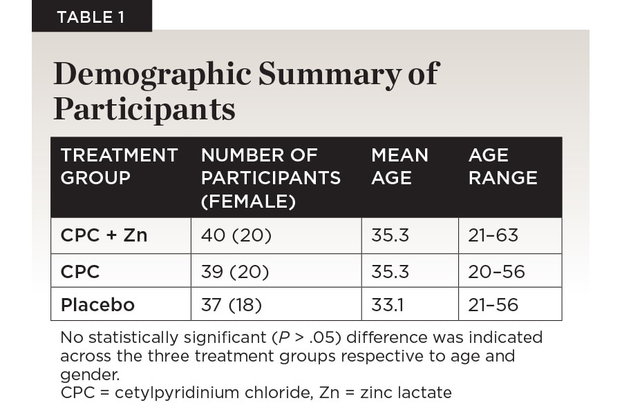 This clinical trial evaluated the antiplaque and antigingivitis efficacy of a mouthwash formula containing 0.075% CPC and 0.28% zinc lactate in an alcohol-free base (CPC + Zn) versus a mouthwash with 0.075% CPC in an alcohol-free base (CPC) and a fluoride-free and alcohol-free placebo mouthwash. The addition of zinc salt to enhance oral care formulations has been seen previously with evidence that zinc salt acts in a compounding manner to antimicrobial properties.9-11 Previous research in vitro supports the evidence that CPC + Zn combats pathogens associated with periodontal disease without destroying the healthy balance of the oral microbiome.12 The addition of zinc lactate to the formula also increased its efficacy in vivo, as evidenced by a 54.5% greater reduction in gingivitis severity after 6 weeks of use compared to a mouthwash formula containing 0.07% CPC alone.13 Of note, zinc has been shown to combat halitosis-associated bacteria as a clinically effective additive against oral malodor.14,15