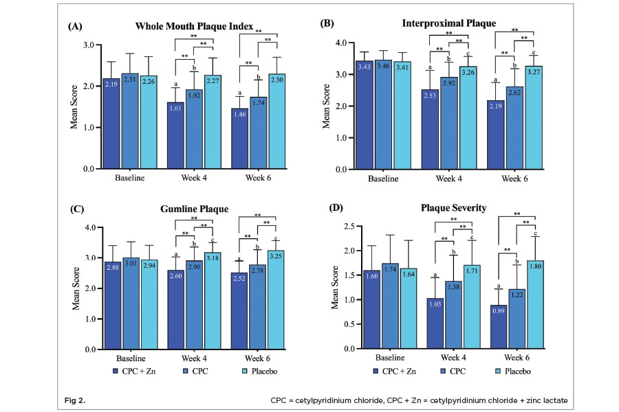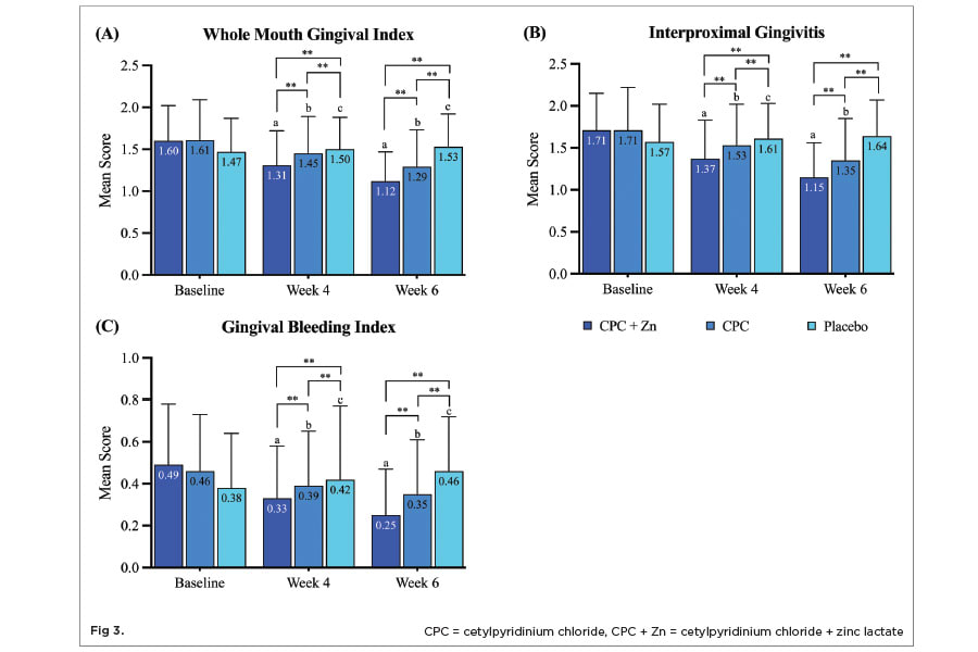 This 6-week study demonstrated the superiority of CPC + Zn mouthwash in treating individuals with established dental plaque and gingivitis compared to mouthwash containing CPC alone or rinsing with a fluoride-free, alcohol-free placebo mouthwash. Both CPC + Zn and CPC treatments significantly reduced plaque and gingivitis across all indices compared to baseline and the placebo treatment. However, the CPC + Zn treatment provided significantly greater reductions at 4 weeks than the CPC treatment was able to achieve even after 6 weeks.