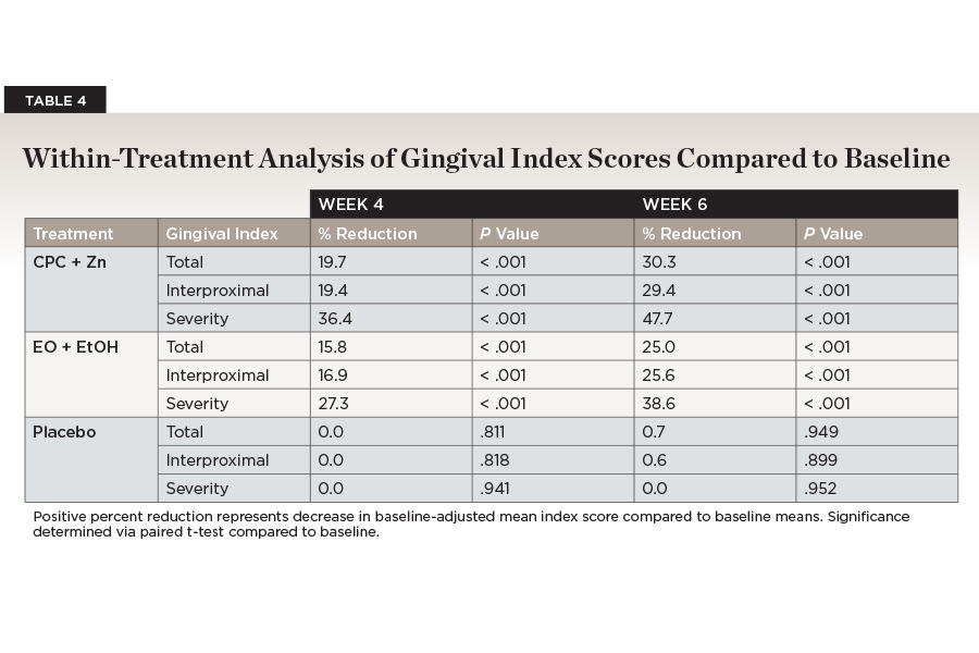 The EO + EtOH treatment group had a 28.3% greater reduction in total plaque, a 24.6% greater reduction in interproximal plaque, and a 34.2% reduction in plaque severity after 6 weeks of rinsing with EO + EtOH mouthwash compared to the group that rinsed with a placebo mouthwash (all: P < .001) (Table 5).