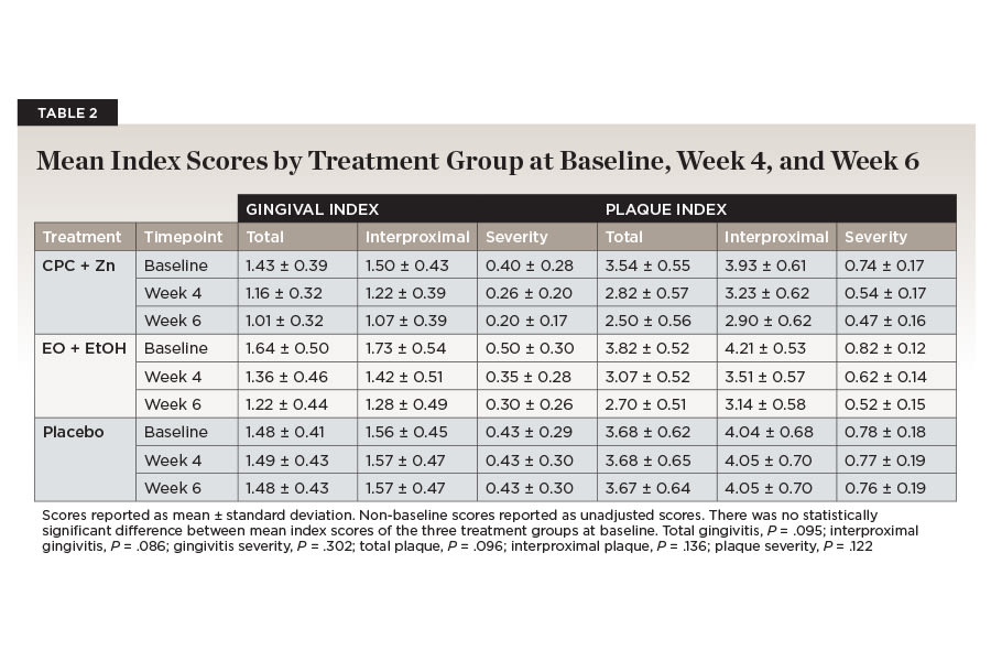 This 6-week clinical trial demonstrated parity between CPC + Zn and EO + EtOH mouthwash formulas in the reduction of dental plaque and gingivitis. Both treatment groups significantly reduced whole-mouth, interproximal, and severity plaque and gingivitis scores compared to baseline and the placebo. While there was no significant difference between the efficacy of these two mouthwashes compared to each other, CPC + Zn consistently outperformed EO + EtOH compared to placebo, as evidenced by a 47.7% greater reduction in gingivitis severity by CPC + Zn after 6 weeks of treatment compliance compared to a 38.6% greater reduction after EO + EtOH treatment.