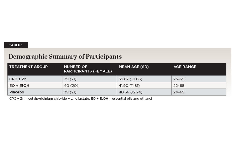 One-hundred-twenty participants were accepted into the study based on the inclusion and exclusion criteria (Figure 1). Two participants were dismissed for not complying with protocol requirements. One-hundred-eighteen participants were randomized into the CPC + Zn treatment group (n = 39; female = 21), the EO + EtOH treatment group (n = 40; female = 20), and the placebo group (n = 39; female = 21). The age range for the CPC + Zn group was 23 to 65 (mean ± standard deviation [SD]: 39.67 ± 10.86). The age range for the EO + EtOH group was 22 to 65 (41.90 ± 11.81). The age range for the placebo group was 24 to 69 (40.56 ± 12.24). There were no statistically significant differences between gender (P = .925) or age (P = .693) across the three treatment groups (Table 1).