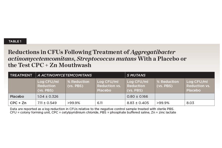 An in vitro biofilm study comparing mouthwash containing 0.075% CPC and 0.28% zinc lactate to a negative control with no active ingredients, mouthwash containing only 0.075% CPC, essential oil mouthwash, and mouthwash with essential oils in an alcohol base found that CPC + Zn continued to significantly reduce bacterial biofilm viability 2 and 5 hours post-treatment by 42.8% and 62.1% compared to negative control, respectively.31 It was the only mouthwash in the study that significantly reduced biofilm viability over time.