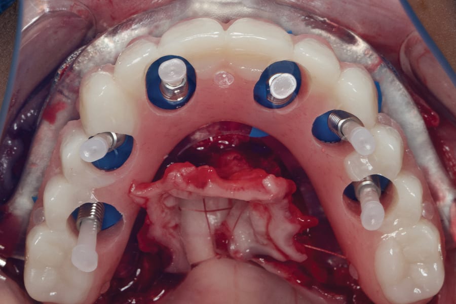 A 3D-printed metallic bone reduction guide is screwed to the jawbone (Figure 3) once its intended orientation has been determined using the occlusal indexing guide, which is used to ensure that the bone reduction guide is fixated in the correct position. The occlusal indexing guide is stabilized in the incisal and occlusal surfaces of the existing teeth. After completion of the bone reduction and extractions, an osteotomy guide is secured onto the metallic reduction guide for exacting, fully guided implant placement (Figure 4).