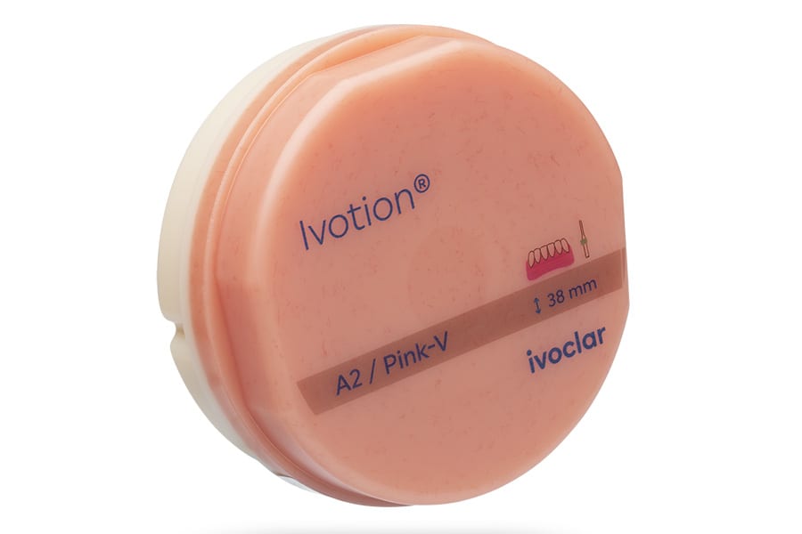 Ivotion combines both tooth and denture base material in a single disc and offers an astonishing level of efficiency due to the unique Shell Geometry. Complete dentures are milled from one disc in one milling process and with only a few manual working steps.