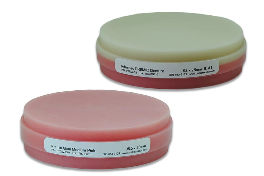 Primotec’s denture discs are available in a two-layered disc that is half gingiva and half tooth-colored as well as a solid pink denture base disc. The denture base disc is available in three different shades of pink, offering excellent physical characteristics.