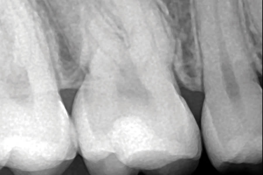 In a radiograph acquired prior to the removal of a patient's orthodontic hardware, a mid-crown radiolucency was noted on the maxillary right first molar (ie, tooth No. 3) (Figure 1). A visual examination of the crown did not indicate the presence of an obvious Class I lesion at the surface (Figure 2); however, the initial access revealed a penetrating caries lesion (Figure 3). After all of the soft carious substance was debrided, the preparation was disinfected by completing two 60-second soaks using a universal desensitizing agent with glutaraldehyde (MicroPrime™ G, Zest Dental Solutions) (Figure 4).3 Next, a round diamond bur was used to remove all of the carious dentin and establish proper retention form (Figure 5). Dentin replacement was achieved with a resin-modified calcium silicate-filled liner (TheraCal LC®, BISCO, Inc) (Figure 6). To replace the enamel, a self-etching bonding agent was applied (Adper™ Prompt™ L-Pop™, 3M) (Figure 7) followed by a bioactive resin-modified glass ionomer (RMGI) restorative material (ACTIVA™ BioACTIVE-RESTORATIVE™, PULPDENT), which was injected to overfill (Figure 8). After a curing light beam was applied for two 20-second exposures (1,200 mW/cm2) (Figure 9), a round diamond bur was used at slow speed to shape the occlusal contour (Figure 10). A final layer of the self-etching bonding agent was then applied to "glaze" the surface and improve the seal of the restoration (Figure 11), after which the occlusion was evaluated (Figure 12). The restoration was found to still be in excellent function with no signs of secondary decay or other complications at both a 2-year postoperative follow-up (Figure 13 and Figure 14) and a 5-year, 2-month postoperative follow-up (Figure 15 and Figure 16).