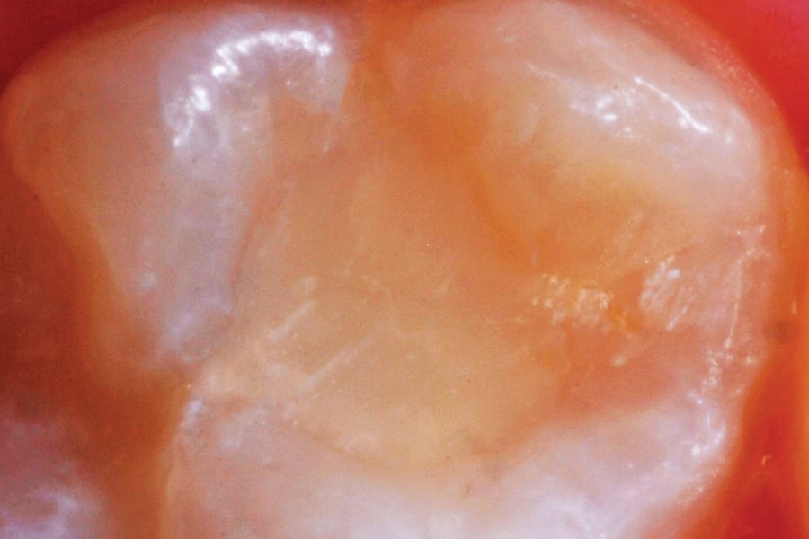As a final note and consideration regarding this restorative technique, when the decision is made to retain affected dentin using selective caries removal combined with indirect pulp capping, disinfection of the residual bacteria in the affected dentin layer is desirable.23 Use of a topical desensitizing agent containing glutaraldehyde (a known antimicrobial agent), like the one used in this case, offers one option to reduce the number of bacteria retained in the affected dentin prior to the sequential application of the overlaying restorative materials.24