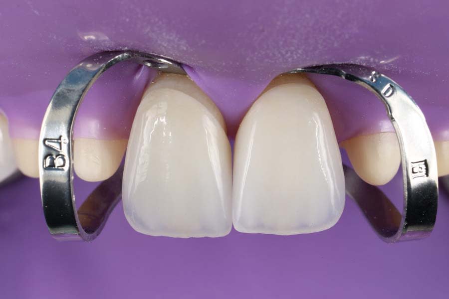 Milled restorations with cut-back designs allowed for optimal esthetic layering.11 To achieve ideal esthetics and incisal translucency, cut-back entailed 0.7 mm to 1 mm buccal reduction from premolar to premolar in both arches and 1 mm incisal reduction for ceramic layering space. Care was taken to ensure smooth transitions between reduced and intact areas. Surface preparation for ceramics after cut-back included air-abrasion with aluminum oxide, ultrasonic cleaning of any residue, and silane primer application for adhesion.