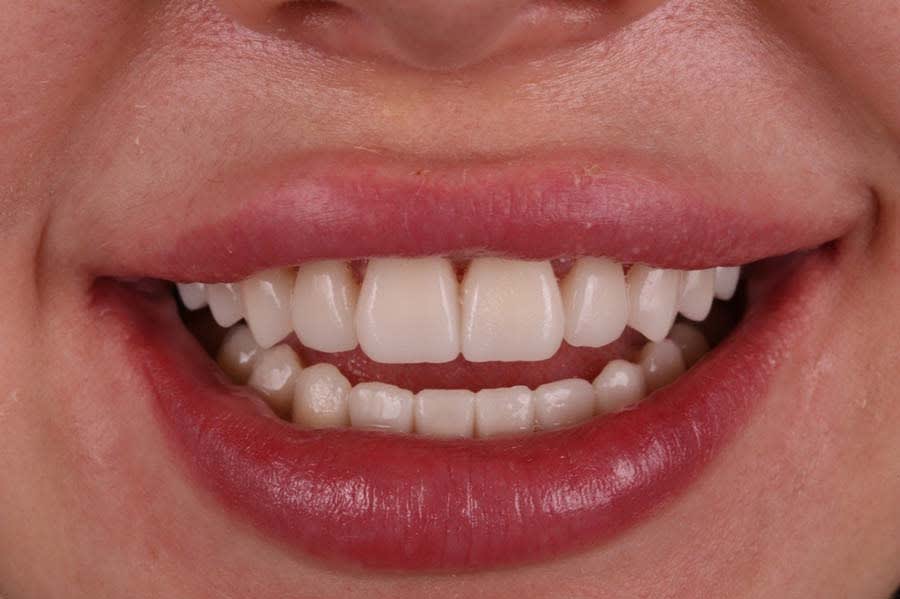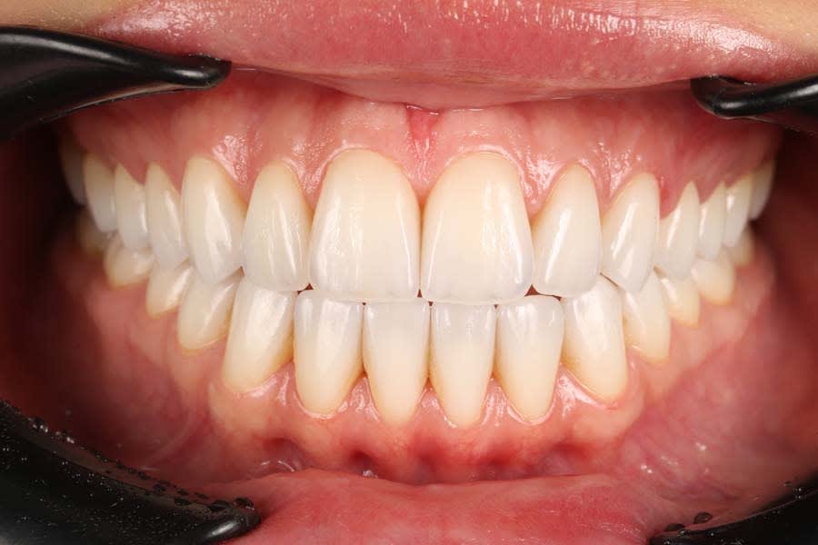 Treatment eliminated the anterior open bite, restored functional occlusion, and achieved harmonious esthetics matching the approved design (Figure 14). Final restorations showed precise proximal contacts and stable margins and required no occlusal adjustments. The multilayered lithium-disilicate restorations closely replicated natural teeth in form, color, and light dynamics.11