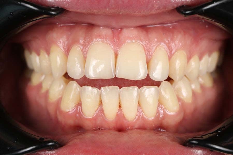 While orthodontic treatment was considered during the initial diagnostic phase, and the use of either fixed orthodontic appliances or clear aligners was discussed with the patient, a comprehensive clinical evaluation dictated that orthodontics alone could not address several fundamental issues present in this case. The primary clinical reasons why an orthodontist was not part of the interdisciplinary team and why orthodontics was excluded as a definitive treatment approach included: significant generalized tooth wear and substantial loss of clinical crown height, which would require restorative intervention regardless of tooth movement; the need to re-establish an appropriate vertical dimension of occlusion, which could not be achieved by orthodontics alone; and a noticeable discrepancy between habitual occlusion and the neuromuscularly guided centric relation (centric occlusion [CO]–CR discrepancy) that was revealed after deprogramming, indicating functional disharmony.