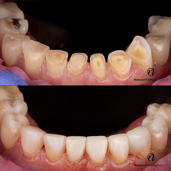 A big proponent of the use of dental photography, Nelson has found OMNICHROMA to be very predictable for multi-tooth anterior cases. In the case shown (right), worn and stained anterior teeth were restored with same-day direct composite veneers. A printed wax-up was duplicated with a clear VPS matrix, and OMNICHROMA BLOCKER Flow was used selectively to mask darker areas before OMNICHROMA was layered to harmonize the final shade and incisal translucency.